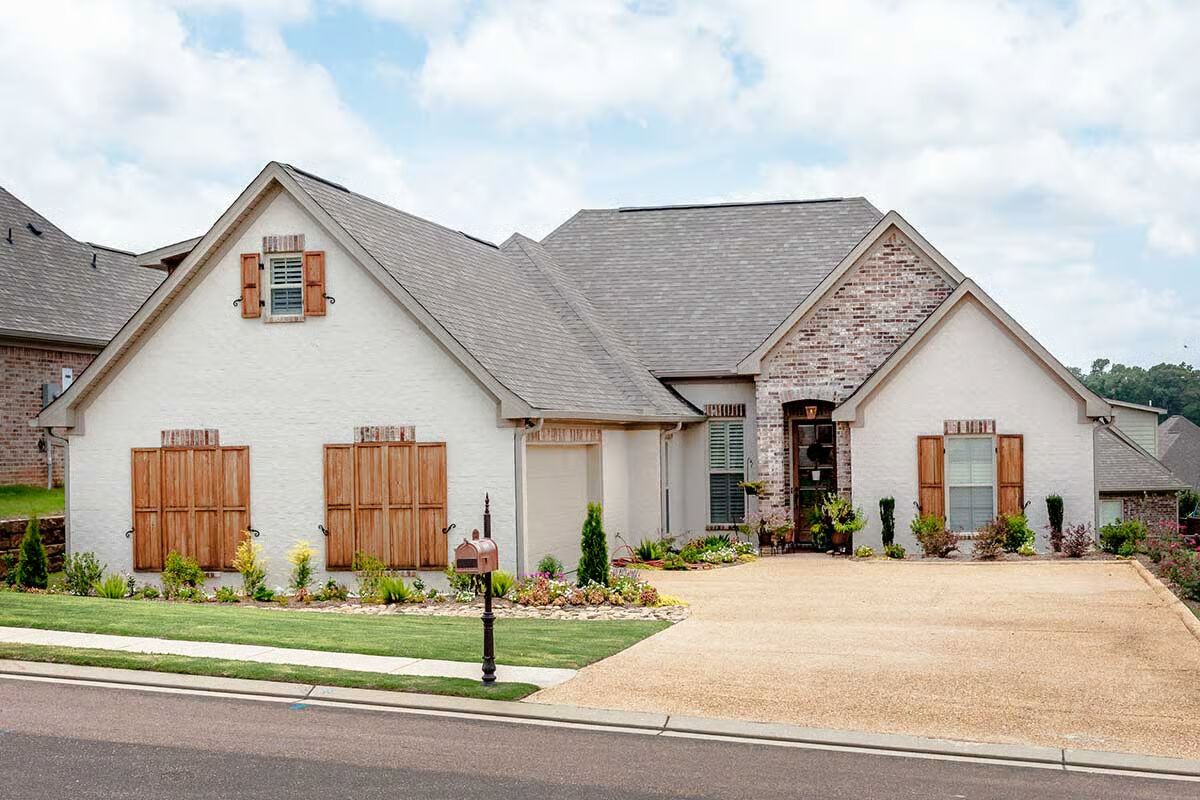 This Southern-style home exudes charm and sophistication with its stucco and brick exterior and courtyard-style garage entry, creating an inviting first impression and exceptional curb appeal.
