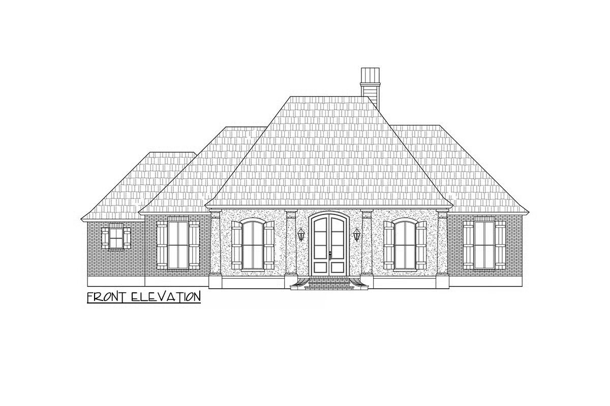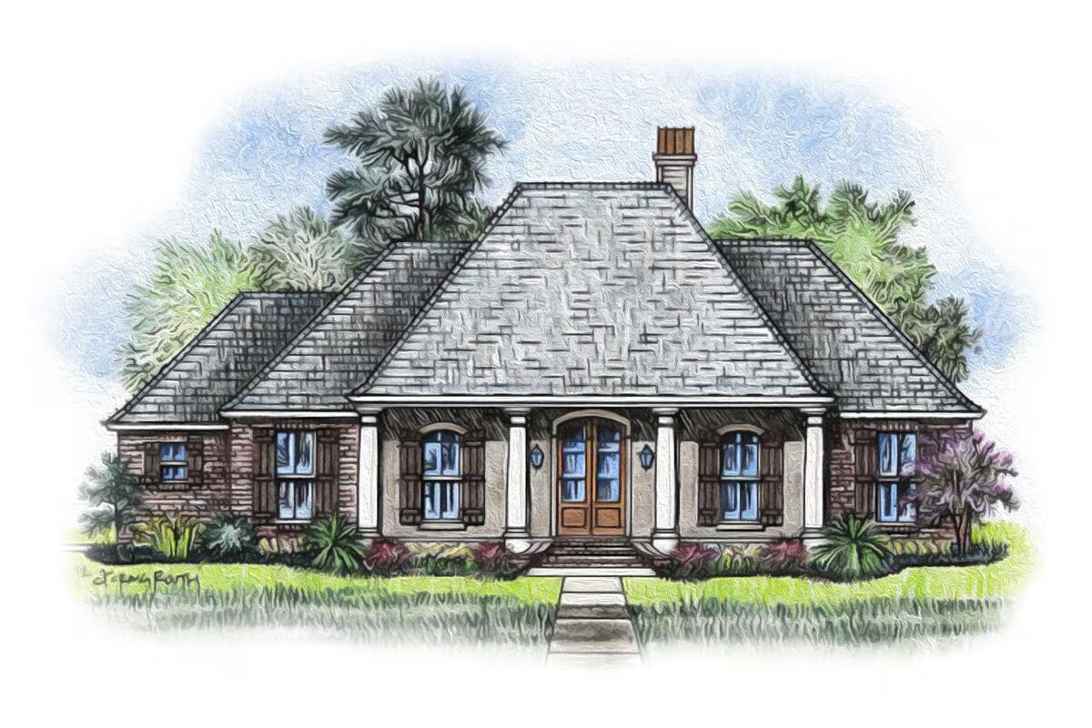 This Acadian-style home plan showcases true Southern charm with its classic hip roof and wide front porch, supported by four elegant columns.
