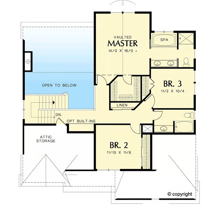 Two secondary bedrooms share a full hall bath, while the upper hallway offers the option to add built-in shelving or cabinetry for extra storage.