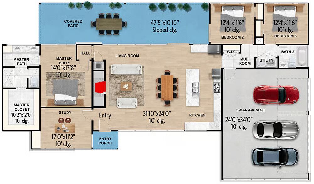 Two additional bedrooms are thoughtfully positioned behind the 3-car garage, with one offering direct patio access for seamless indoor-outdoor living.