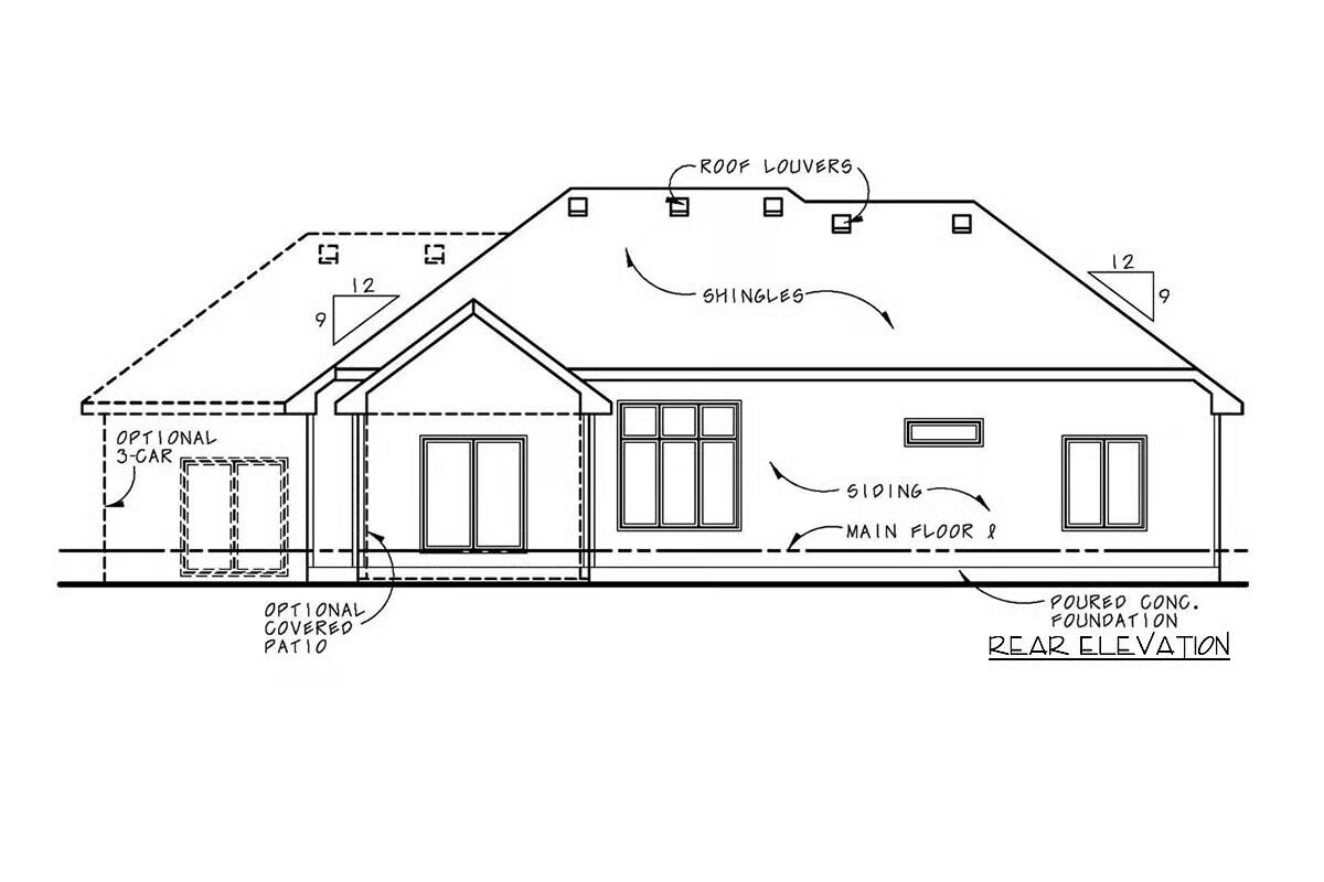 Inside, the layout divides the home beautifully, with the open-concept main living area on the right and the private bedroom wing on the left. The dining room opens to an optional covered patio with sliding glass doors, creating the perfect space for indoor-outdoor living.