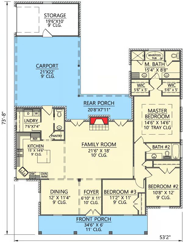 5-Bedroom Traditional Southern House with Stacked Porches - 2660 Sq Ft (Floor Plan)