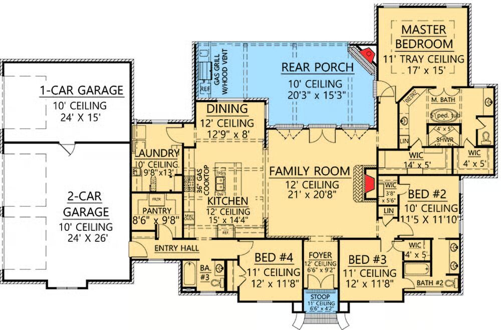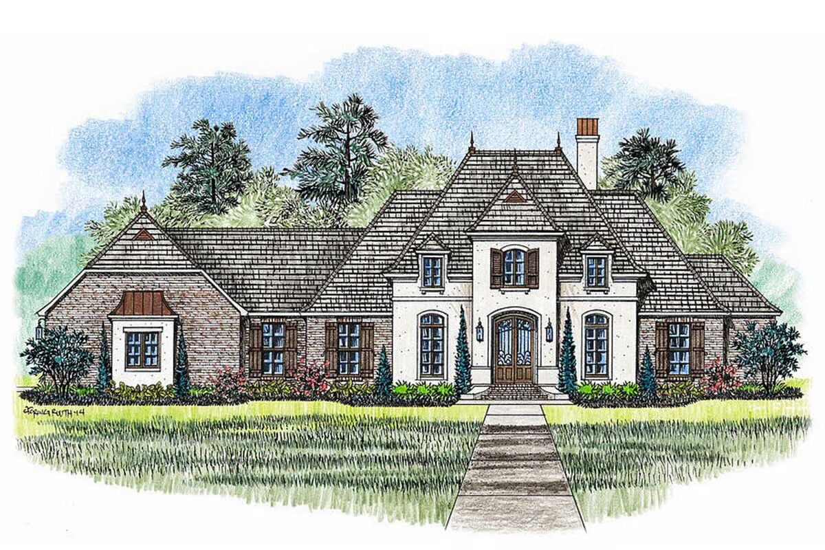 This French Country home plan combines timeless elegance with modern livability, offering 4 bedrooms, 3 baths, and a split design layout.