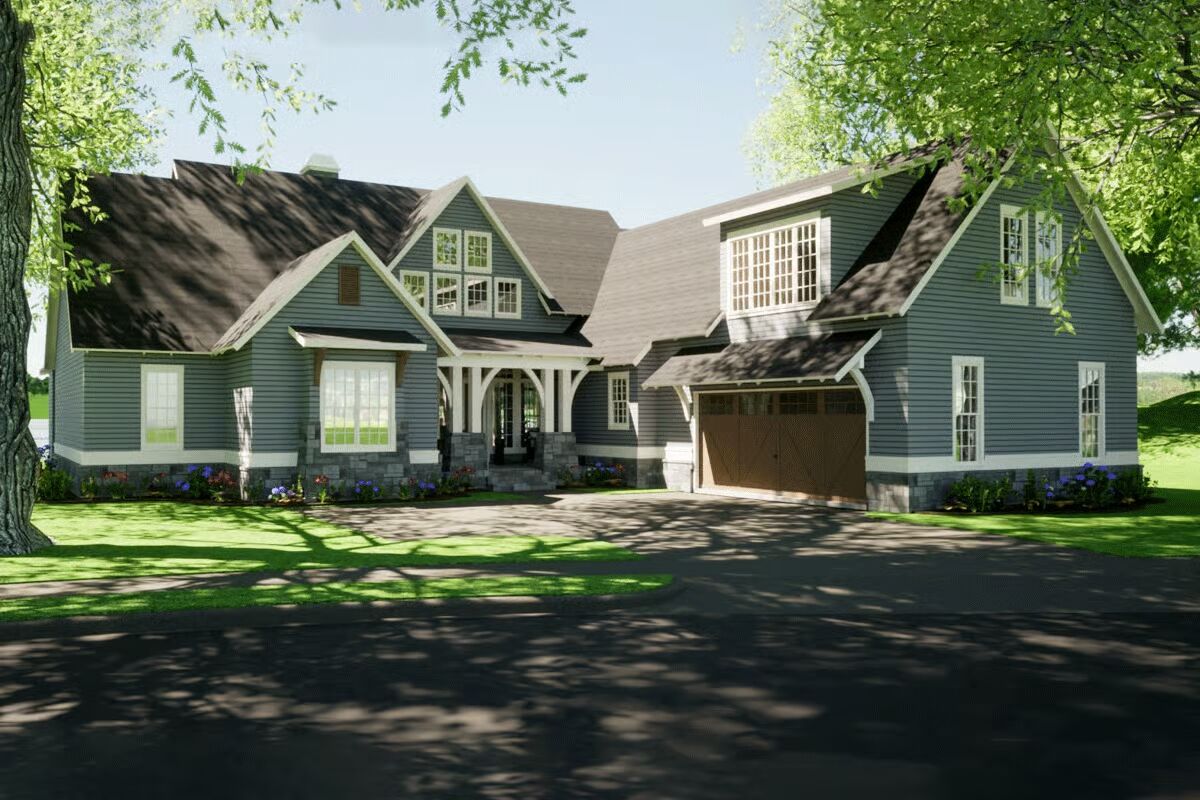 This 5-bedroom country lake house plan pairs timeless Craftsman detailing with stone accents, windofil gables, and a shed dormer above the garage, creating charming curb appeal.