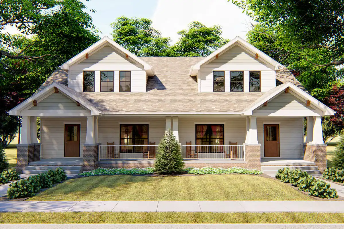 This attractive multi-family home showcases classic curb appeal with dual three-window dormers set above a wide, covered front porch accented by tapered columns.