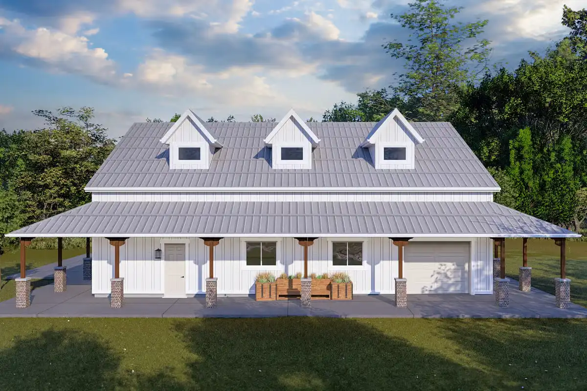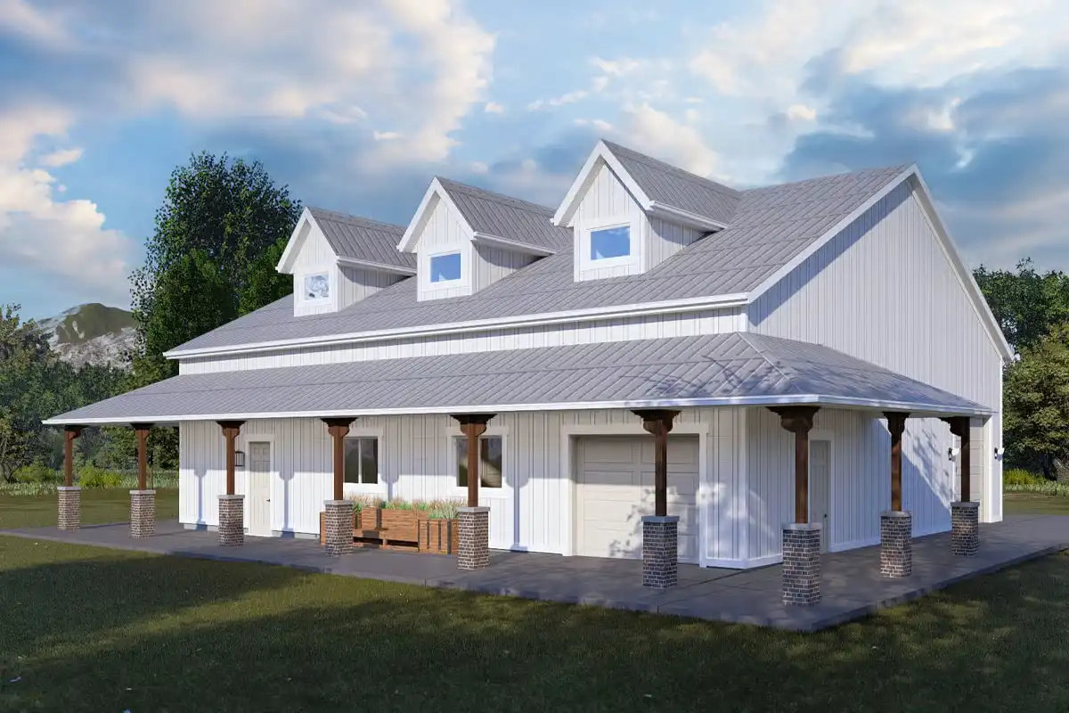 This modern farmhouse–style garage workshop delivers an impressive 3,000 square feet of versatile storage and work space, complete with a convenient full bathroom for easy clean-up.