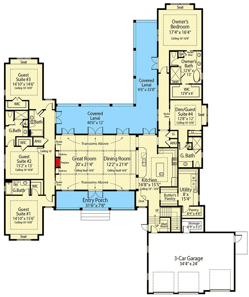 The fireplace surrounded by custom built-ins anchors the great room, while the two-island kitchen—complete with a butler’s pantry and nearby utility room—makes entertaining a breeze.