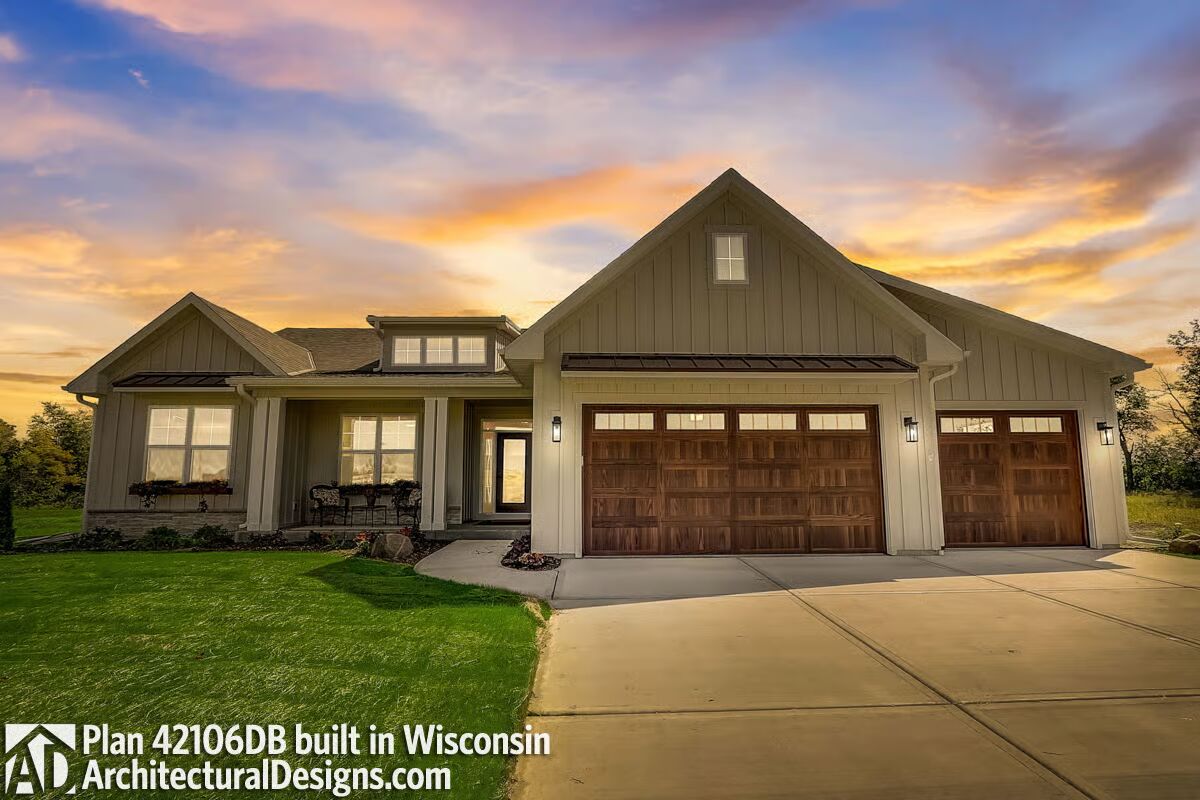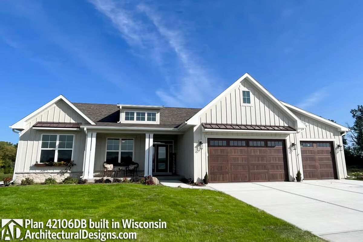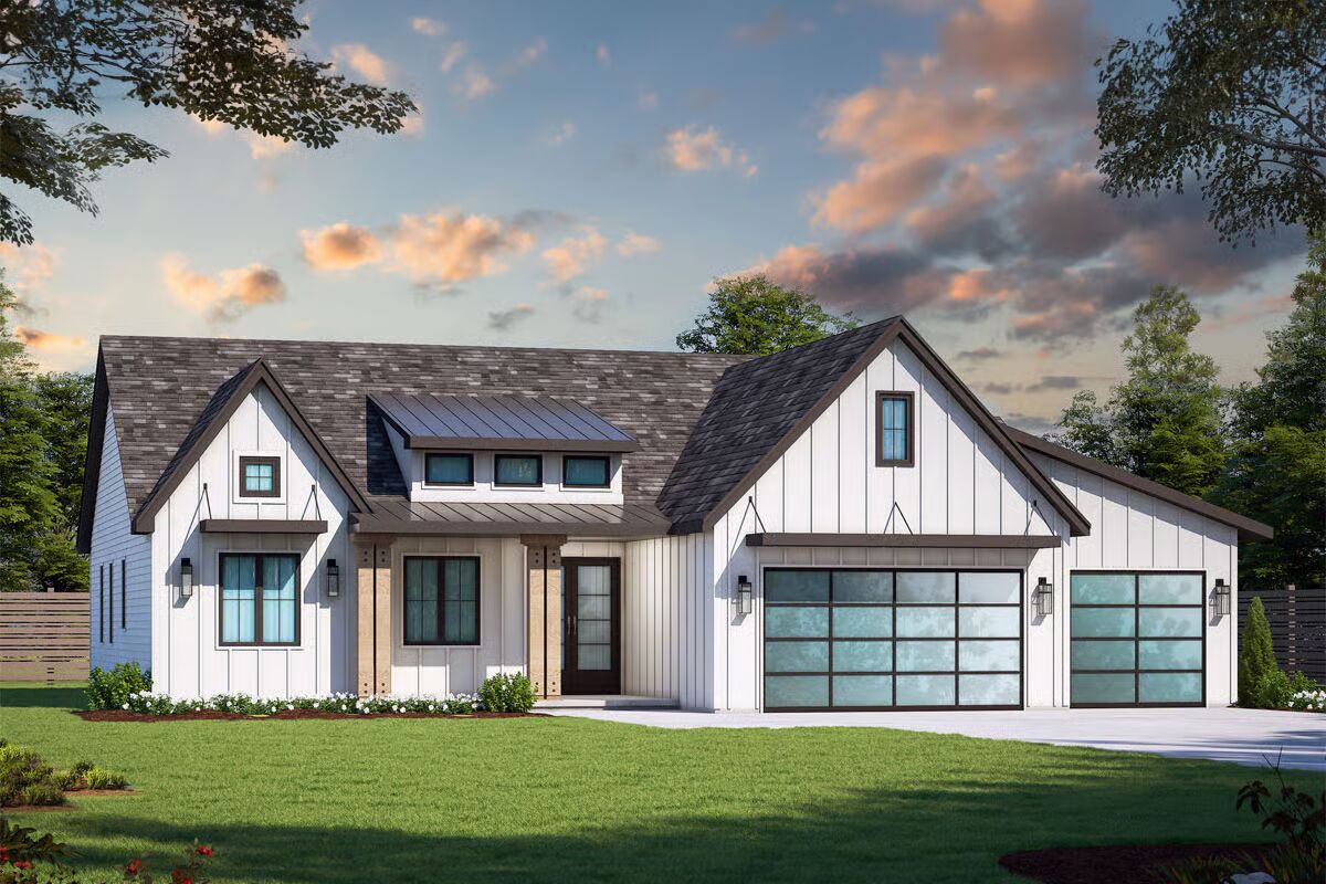 Modern New American design meets everyday comfort in this beautifully detailed home, highlighted by metal roof accents and sleek flat rain awnings that enhance its contemporary curb appeal.