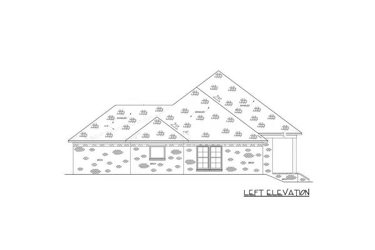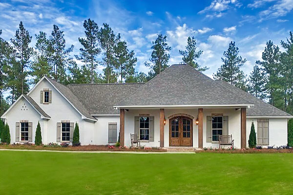 This one-level Acadian-style home exudes Southern charm with its brick façade, rustic shutters, and brick header accents, creating timeless curb appeal.