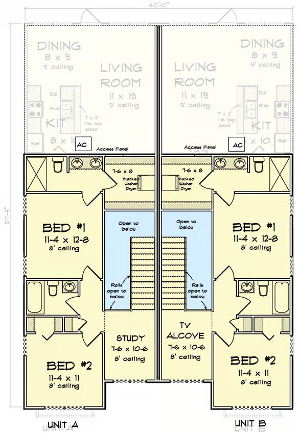 Welcome to the gallery of photos for the Two-Story Traditional Duplex house with Dual Laundry – 1447 Sq Ft Per Unit. The floor plans are shown below: